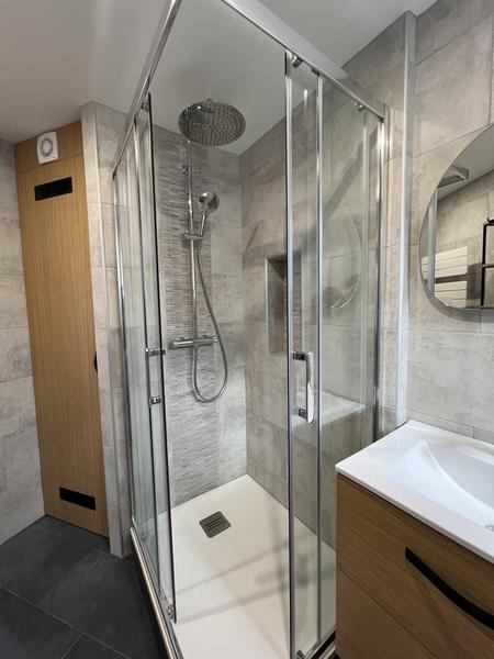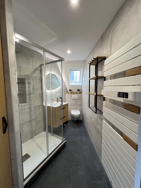 • La salle de bain est équipée: d'une grande douche 100x80cm avec son grand pommeau de douche, un WC Geberit, un meuble vasque avec 2 grands tiroirs, un radiateur sèche serviette, un porte serviette, un sèche cheveux, un kit de premier secours.